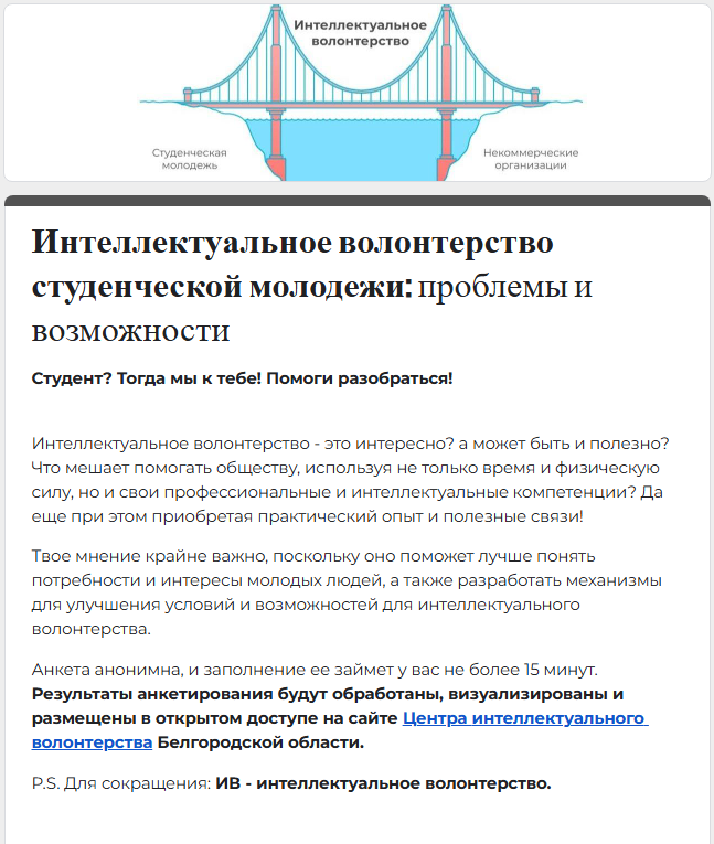 Здесь публикуется информация о мероприятиях, проектах и возможностях участия в интеллектуальном волонтерстве. Присоединяйтесь к сообществу, чтобы быть в курсе событий, обмениваться идеями и включаться в работу над социально значимыми задачами.